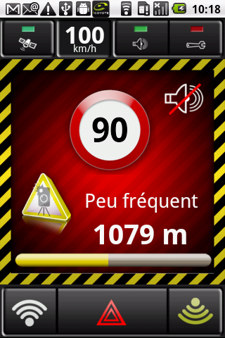 A l’approche d’une zone à risques, l’écran ci-dessous est affiché. Il présente la vitesse limite autorisée, la distance qui vous sépare de la zone et la fréquence d’observation des radars mobiles dans le passé (très fréquente, fréquente, peu fréquente).