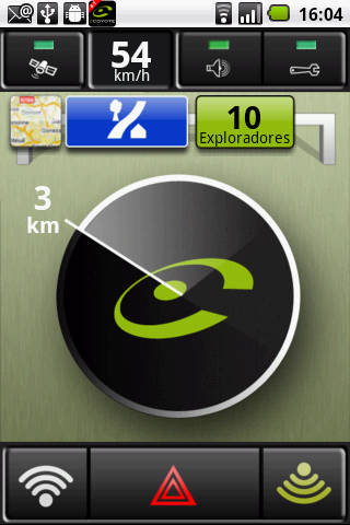 En el modo “carretera secundaria” se muestran los exploradores, en torno a un radio dinámico de entre 1 y 15 Km., con un logotipo central de Coyote y el número de exploradores en verde (14 exploradores en el ejemplo)