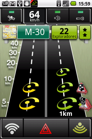 Esta pantalla, aparece durante un viaje por autovía o vía nacional, presenta la información a 40 Km. antes de usted. Además muestra su velocidad, el nombre de la carretera por la que conduce, el radar próximo, el número de exploradores y su grado de confianza.