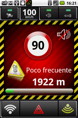 Al aproximarse a una zona de riesgo, aparecerá la pantalla que se muestra a continuación. Ella mostrara el limite de velocidad permitido, la distancia que le separa de la zona de riesgo y la frecuencia observada en la presencia de radares móviles catalogado por (muy frecuente, frecuente, poco frecuente)