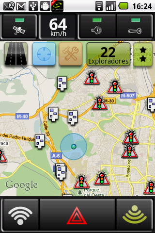 Los exploradores se muestran con el logo de Coyote. En verde, estos se encuentran en el mismo sentido de la circulación, en amarillo, estos se encuentran en el sentido opuesto a la marcha.