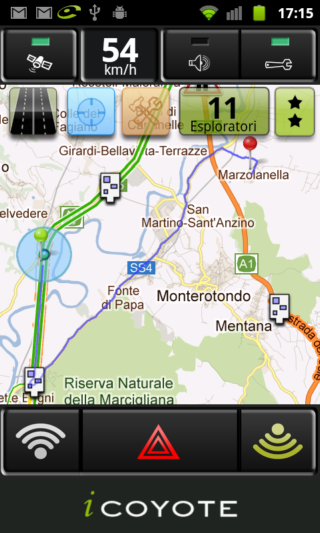 In modalità ‘strade secondarie’ verranno visualizzati gli esploratori attorno a te in un raggio dinamico (da 1 km a 15 km). Gli esploratori vengono visualizzati con un logo Coyote al centro e nel riquadro verde