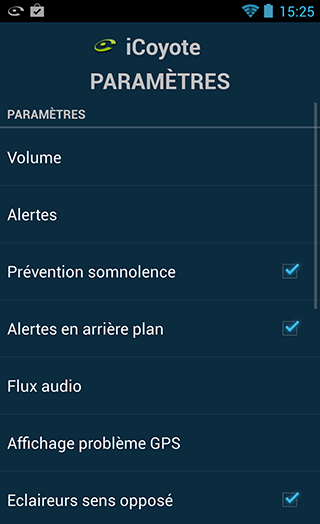 Le menu "Paramètres" permet de personnaliser le comportement de iCoyote en fonction de vos préférences personnelles.