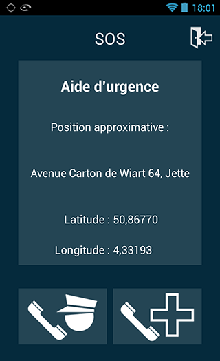 Le bouton SOS, aide d'urgence vous permet d'avoir les informations sur votre lieu actuel (adresse et coordonnées GPS) ainsi que deux boutons pour appeler rapidement les forces de l'ordre ou les urgences en cas d'accident ou de cas de force majeure.