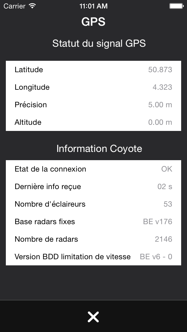 Il vous affiche également l'état de la connexion aux serveurs Coyote, le délai depuis la réception des dernières informations Coyote, le nombre d'éclaireurs, la version de la base de zones de danger ainsi que le nombre de zones de danger et la version de la base de limites de vitesse.