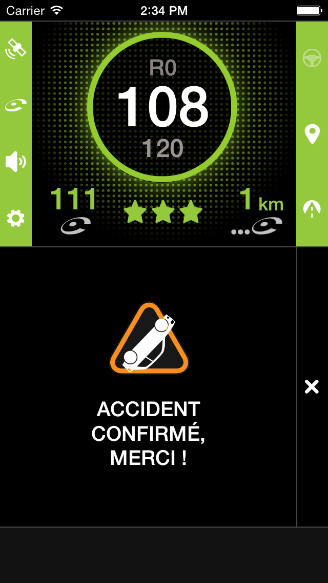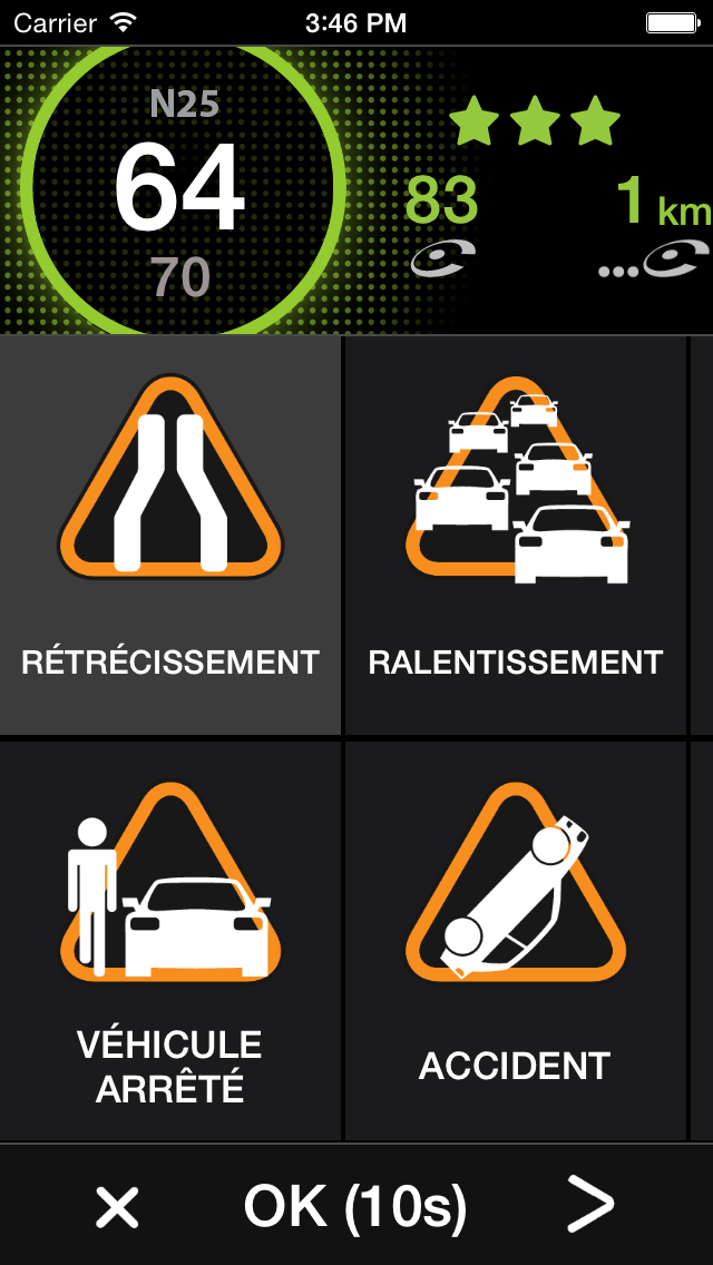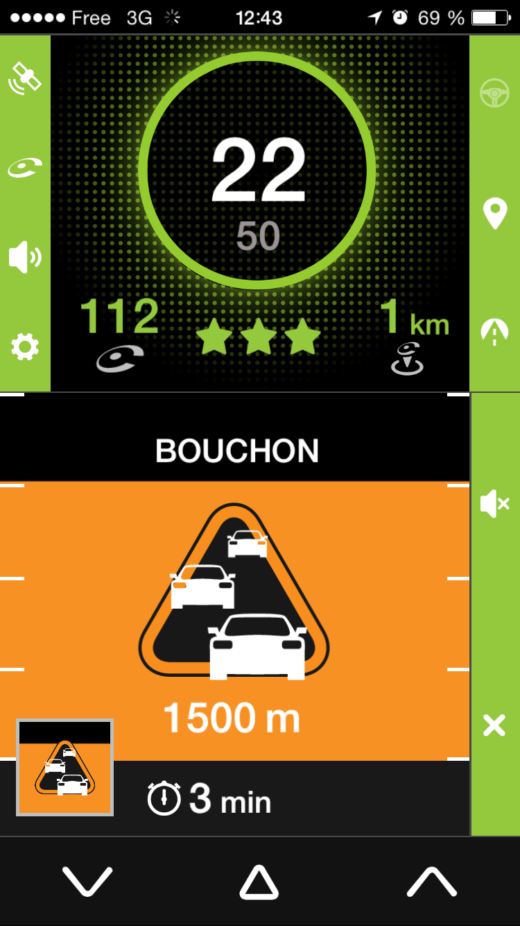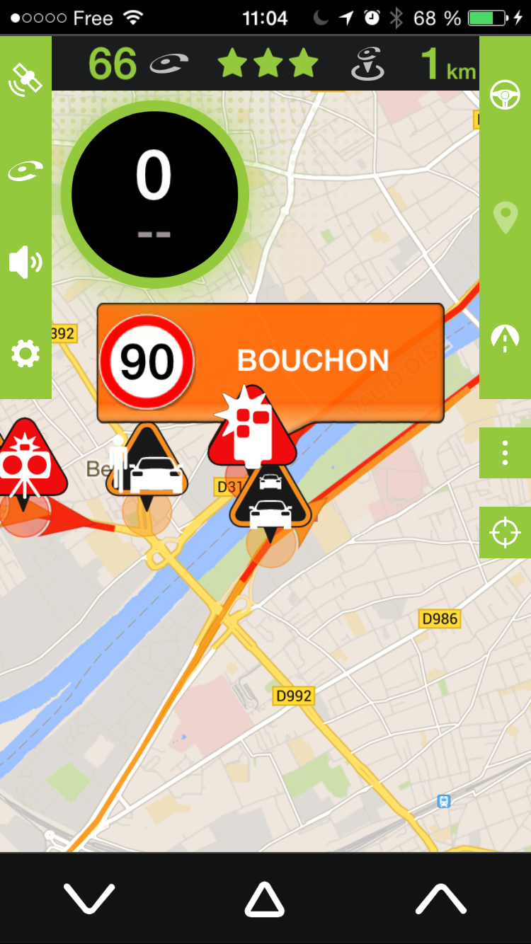 Pour signaler une perturbation routière dans votre sens de circulation, il vous suffit de cliquer sur le bouton central « warning » en bas de l’écran.