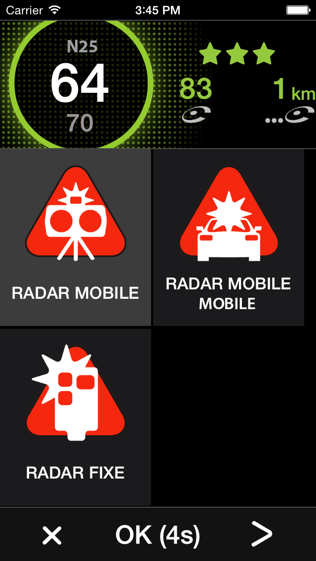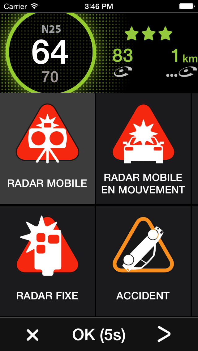 Il vous présente la vitesse limite autorisée, votre vitesse instantanée, la longueur de l’alerte, le temps écoulé depuis sa dernière confirmation de présence (ou premier signalement) et enfin le nombre de confirmations pour cette alerte.
