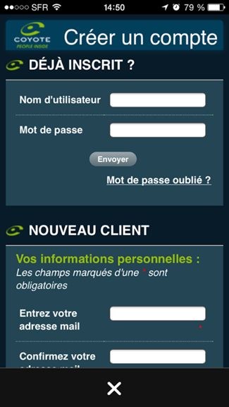 Si vous possédez déjà un compte client Coyote, saisissez votre identifiant et votre mot de passe dans la partie « déjà inscrit ».