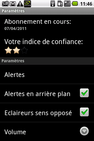 L’application iCoyote nécessite une réception GPS de qualité en permanence ainsi qu’une réception GSM (2G ou 3G) par intermittence. Une couverture GSM permanente n’est pas nécessaire à la bonne marche de l’application.